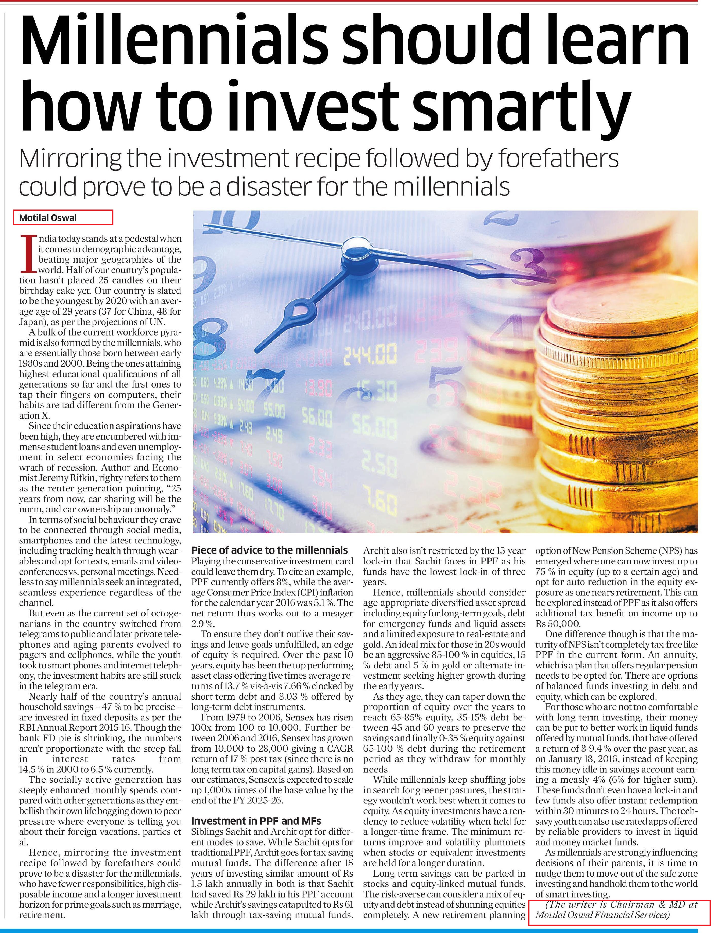 Millennials should learn how to invest smartly says Mr. Motilal Oswal of Motilal Oswal Financial Services https://goo.gl/8KPtDz