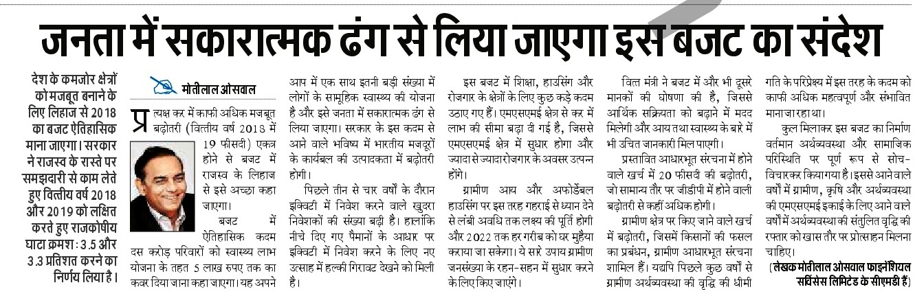 Public will take this budget positively: Mr. Motilal Oswal, CMD, MOFS https://goo.gl/9eGBPp