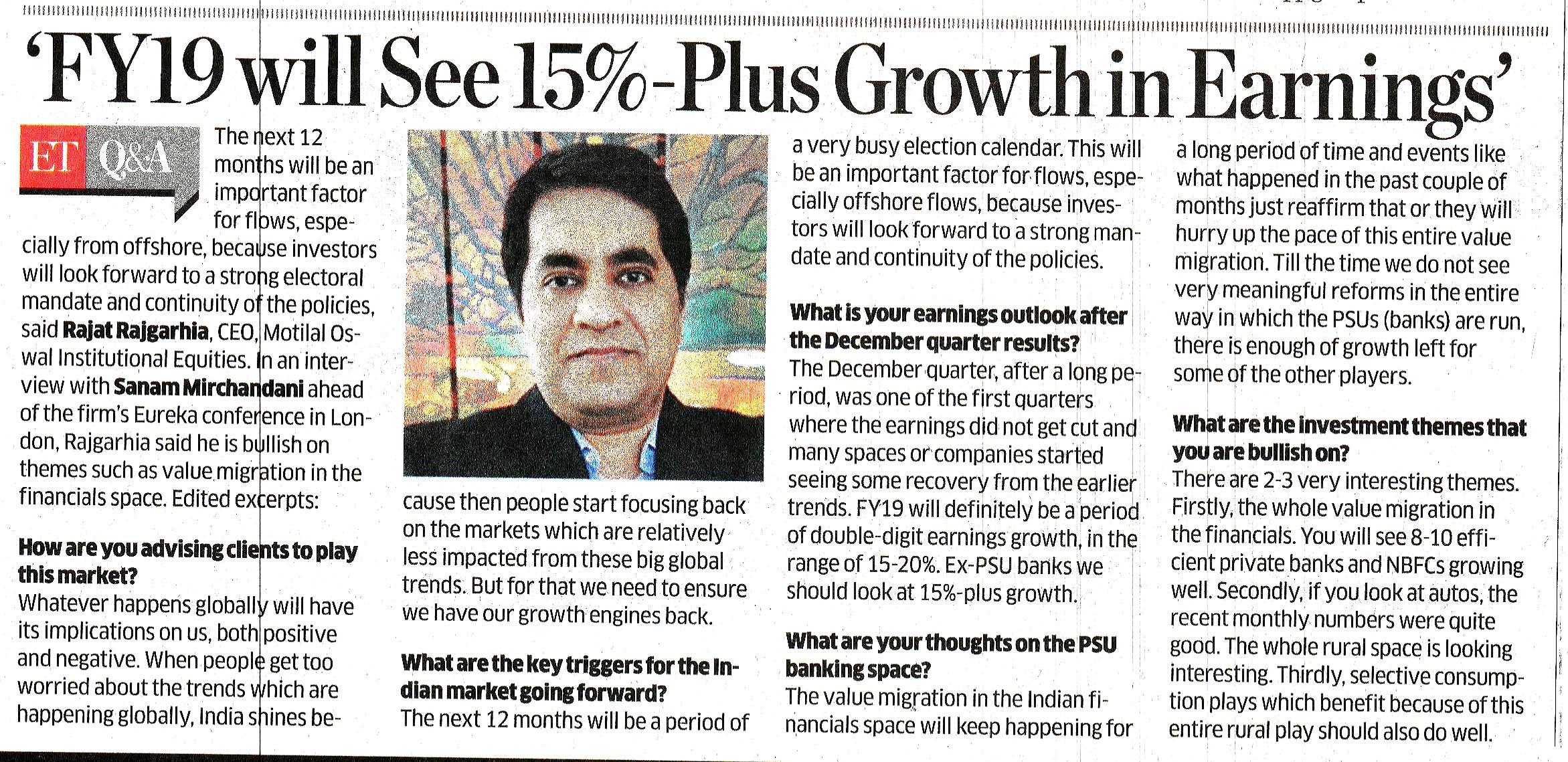 FY19 will see 15% - Plus Growth in Earnings - Mr. Rajat Rajgarhia, Motilal Oswal https://goo.gl/RpBRnw